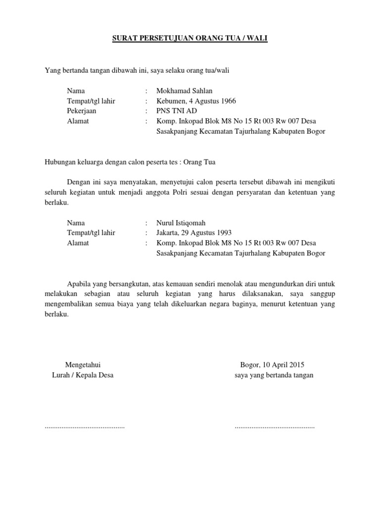 LA KANDI SPd TempatTgl Lahir. Daftar riwayat hidup j. Surat Persetujuan Orang Tua untuk Daftar Polisi - Selain surat permohonan menjadi anggota Polri atau Polisi berkas persyaratan lain yang wajib disiapkan atau dilengkapi oleh pelamar dalam tahap pendaftaran adalah surat persetujuan orang tuawali untuk menjadi anggota Polri. Surat perjanjian ikatan dinas pertama anggota polri k. Dan untuk berbagai keperluan orang tua pun harus berperan terkait dengan anak. Persetujuan orang tua atau wali artinya pihak orang tua atau wali pelamar calon peserta menyetujui atau mengizinkan anaknya untuk mengikuti seluruh kegiatan dalam rangka untuk menjadi anggota polri sesuai dengan contoh surat persetujuan orang tuawali untuk mendaftar tamtama polri.