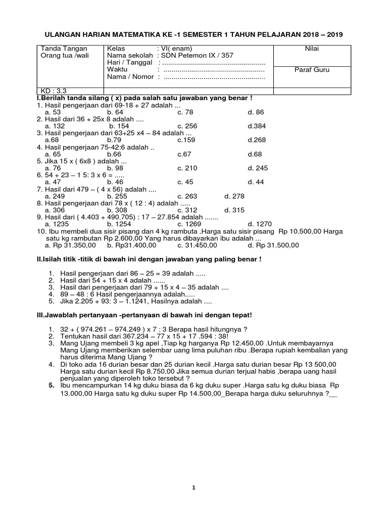 Soal Uts Uas Us Ulangan Harian Sd Kelas 1 2 3 4 5 6 Semua Mata Pelajaran Sch Paperplane